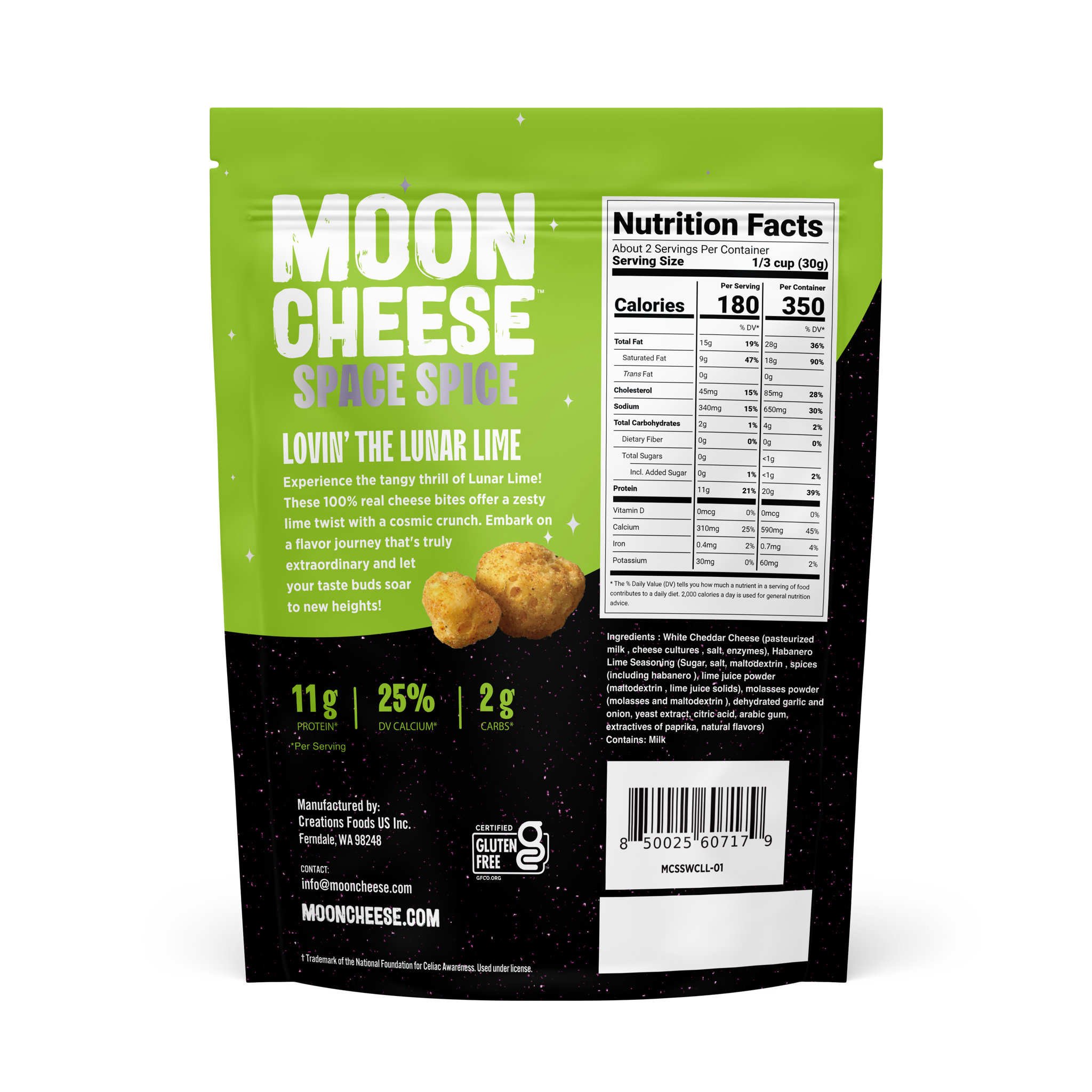 Get ready to launch your taste buds into orbit with Moon Cheese Lunar Lime! These insanely delicious bites are bursting with rich, savory 100% white cheddar flavor paired with a zesty lime kick. Packed with protein to fuel your day, each bite delivers the perfect balance of bold flavors and satisfying crunch. Whether you’re reaching for an afternoon pick-me-up or need a savory snack to power through, Lunar Lime will expand your taste horizons and keep you fueled with every crunch. Blast off into flavor today!